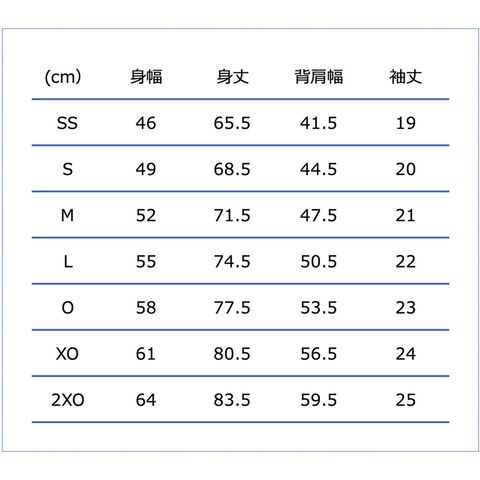 XO(チェスト102-106cm、身長182-187cm)、2XO(チェスト106-110cm、身長187-192cm)