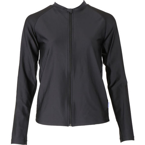 上下が分かれたセパレーツ型で、長袖の上着はできるだけ露出を軽減し紫外線対策にも有効です.またボトムスはハーフパンツを採用しており、体のラインが出にくい形状になっています.男女共に身体的な違いが表れる部位(胸、腰、お尻など)はゆったりしたシルエットになるよう素材を変え、パターンを微調整.体型の違いが目立たないデザインにしました.上着は一枚で着て泳げます.またロック機能式のファスナーと引き手部分にはガードを付け、不意に開かない工夫をしています.撥水加工を施しているため濡れても軽く快適な着心地です.