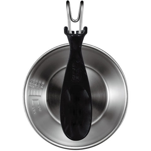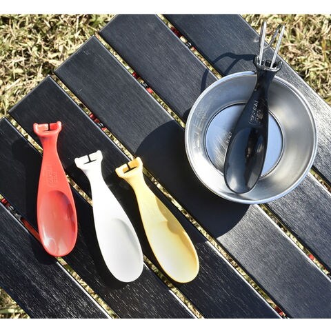シェラカップのハンドルに取り付けて携帯できる、シェラカップ専用スプーンです.耐熱性のある樹脂を使用しているので、調理にも使え、熱の伝わりも低く、口あたりもなめらかです.底面が水平でスタンディングできるため衛生的です.ワイヤーハンドルタイプのシェラカップに取り付けが可能です.(ワイヤー幅16mm程度)