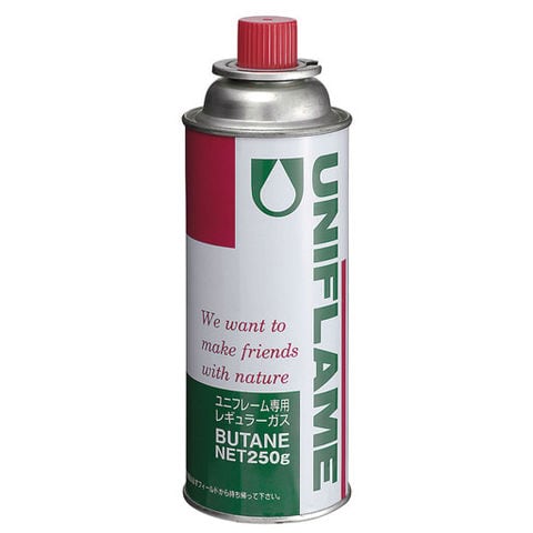 UNIFLAMEのガス燃焼機器はすべてカセットボンベを使用.一般的なレギュラーガスと、アウトドアでの過酷な使用状況でも快調に燃焼するプレミアムガスの2種類.[専用]という安心感のあるレギュラーガス.目的に合わせてお選びいただけます.