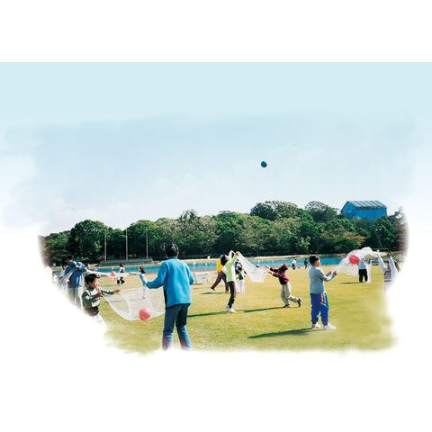 カラダにやさしい、ネット・ネットゲーム.2人の呼吸を合わせてタイミング良くボールを速く、強く、遠くへ.基本的に 2 人が意気を合わせることで楽しむリードアップゲームです. 2 人でネットを持ち、レジンボールを 2 人で意気を合わせ、頭上に上げたり、飛ばしたりします. 何組かでボール送りゲームをしたり、ネットをラケットがわりにしてボールゲームを楽しむこともできます.