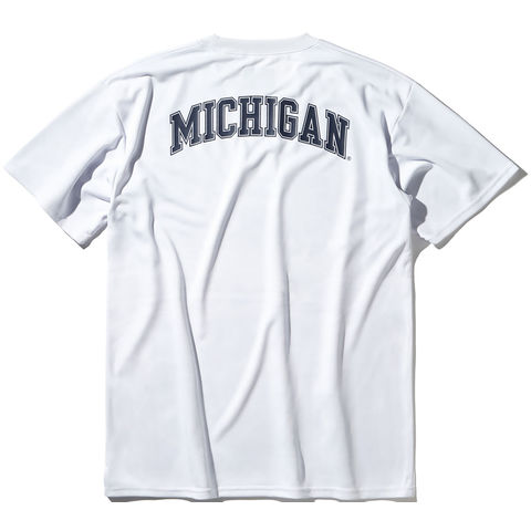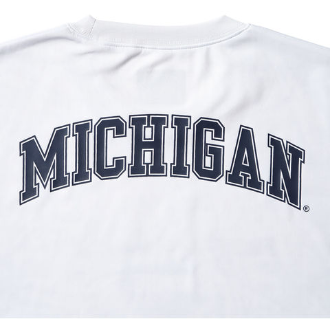 MICHIGAN ロゴをアーチに配したバックプリンの T シャツ.