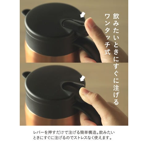 特徴:ダイレクトにコーヒーを淹れて美味しい温度をしっかりキープ.飲みたいときにすぐ注げるワンタッチ式.お手入れしやすい広口設計&テフロン加工.