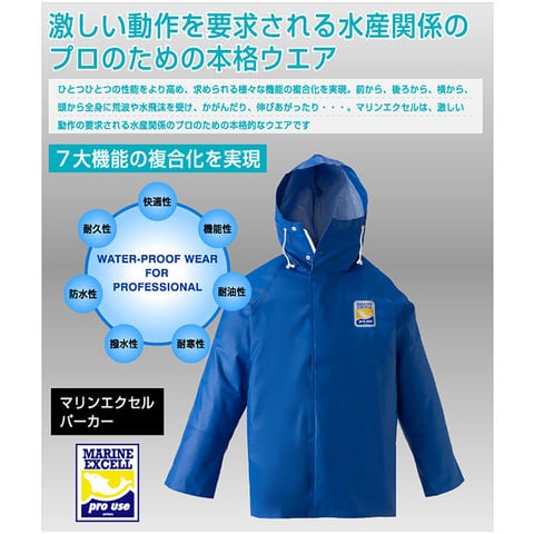 激しい動作を要求される水産関係のプロのための本格ウエア.ひとつひとつの性能をより高め、求められる様々な高機能の複合化を実現.前から、後ろから、横から、頭から全身に荒波や水飛沫を受け、かがんだり、伸びあがったり.軽量で動作性にも優れているので、快適に長時間着用できます.表面はフラット仕上げなので、簡単に汚れを落とせます.