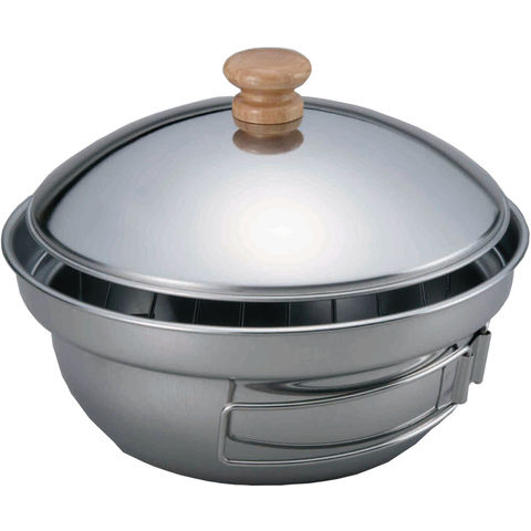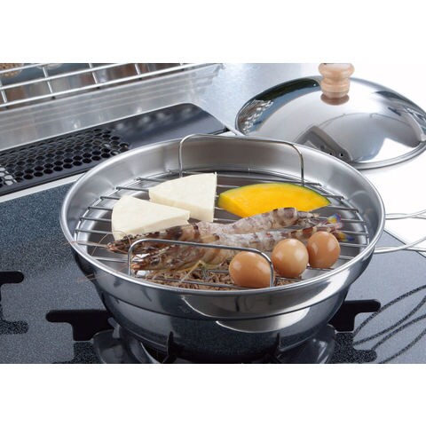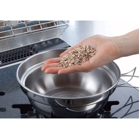 自宅のキッチンで簡単に燻製を楽しめます◆鍋本体はステンレス製.収納に便利な折りたたみ式ハンドル付きです.燻煙網はフタを浮かせて余分な煙を排気するため、特殊な形状に加工した網です.木製のつまみは燻煙中の熱くならないので、食材の確認に便利です.