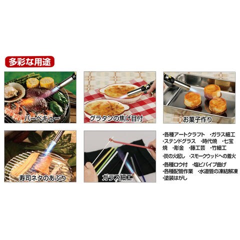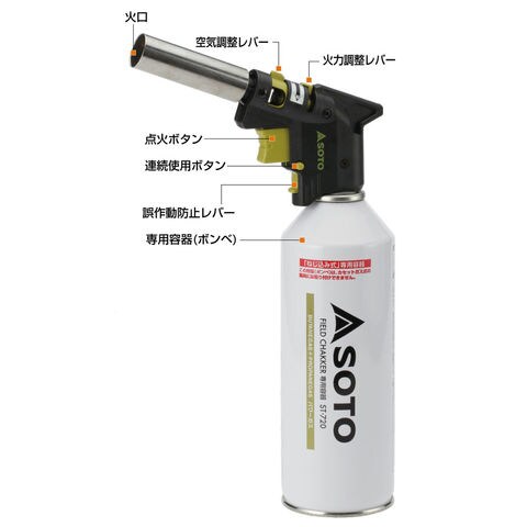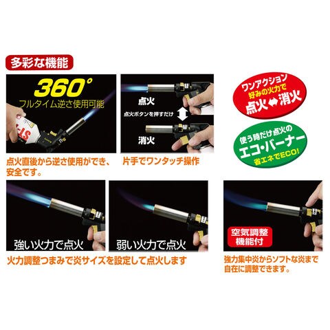 多彩な機能を備えたアウトドア用強力耐風バーナーです.点火、消火の操作はライター感覚.空気調整機能、連続使用、ロック機能、誤作動防止機能など多彩な機能を搭載.アウトドアレジャー、DIY、本格的な作業まで用途も多彩.