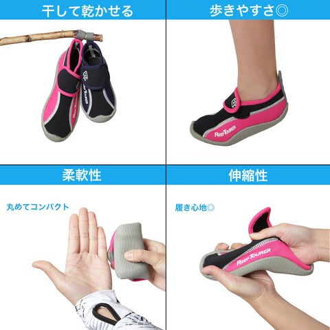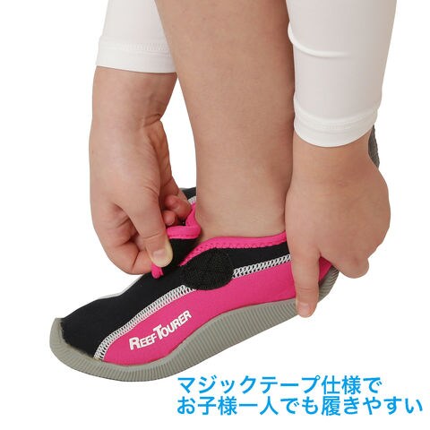 シンプルで機能性に優れたお子さま向けシューズ.ビーチ・岩場での足元の滑りやケガを防ぎます.お子さま一人でも履きやすい仕様になっています.