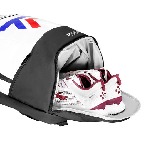 過酷なテニスツアーに耐えうる素材を使用.従来サイズより一回りサイズが小さくなったため.持ち運びもしやすくなっている.ラケット収納可能.シューズ収納スペース付き.