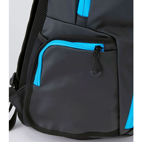 [ TEAM ARENA ]デザインのバックパック.プールサイドでも使用しやすいはっ水素材を使用し、機能面にこだわったバックパック.正面のメインルームは大きく開くことで物の出し入れがしやすく、約 30L 収納可能.すぐに出したい物を収納するのに便利な縦方向へ開くファスナーポケットと、メインルーム内部には PC や A4 ファイルが収納できるポケット付き.パスケースや小物等の収納に便利な両サイドのポケットは背負ったままでも開けやすいファスナー設計.側面ポケットの収納は底メッシュ設計になっているので水はけがよく、ボトルや折りたたみ傘の収納が可能.また背面には通気性のあるバックパネルを採用し、さらに肩パットに付属しているショルダーベルトを調整する・