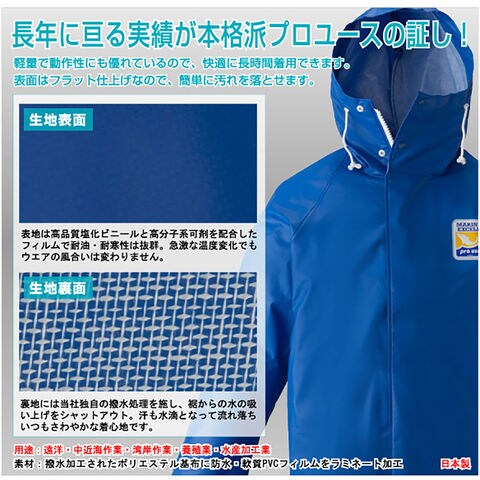 激しい動作を要求される水産関係のプロのための本格ウエア.ひとつひとつの性能をより高め、求められる様々な高機能の複合化を実現.前から、後ろから、横から、頭から全身に荒波や水飛沫を受け、かがんだり、伸びあがったり.軽量で動作性にも優れているので、快適に長時間着用できます.表面はフラット仕上げなので、簡単に汚れを落とせます.