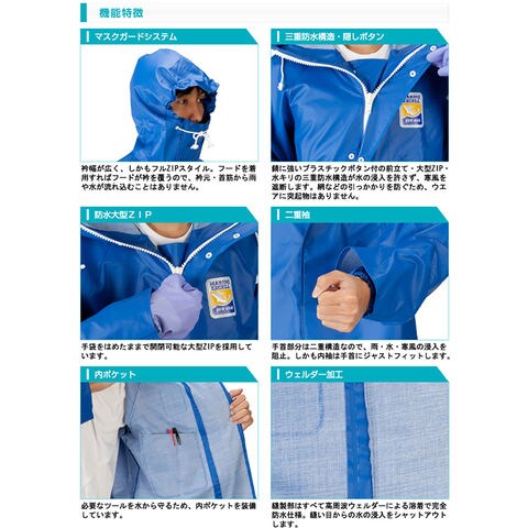特徴:衿幅が広く、しかもフル ZIP スタイル.フードを着用すればフードが衿を覆うマスクガードシステム.三重防水構造・隠しボタン.手袋をはめたまま開閉可能な防水大型 ZIP .二重袖で雨・水・寒風の浸入を阻止.内袖は手首にジャストフィット.内ポケット装備.ウェル・