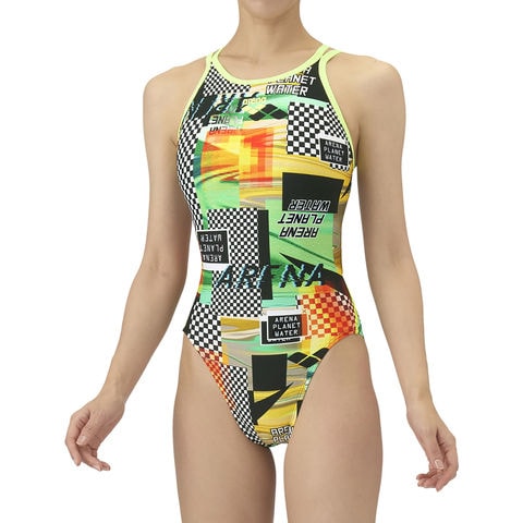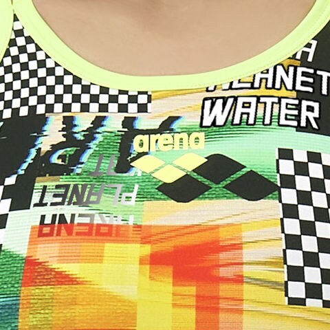 トレーニングカテゴリー[TOUGHSUITシリーズ].大会に向けて練習を重ねる頻度が高いスイマーにオススメの練習用水着.環境に配慮したリサイクルポリエステル素材を使用し塩素に強く長持ち.肩紐をダブルストラップにすることで1点にかかる圧を2点に分散させ、肩に感じる負担を減らし、よりよい着心地を実現.ランダムな色の変化やエフェクトが生み出す動きのあるグリッチアート柄を取り入れたスタイル.デジタル感とレトロな要素を融合させたデザイン.前身頃に黒の裏地付き.ワンピースタイプ.