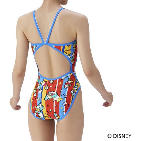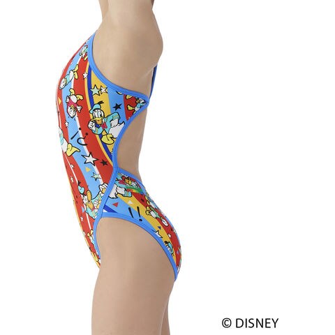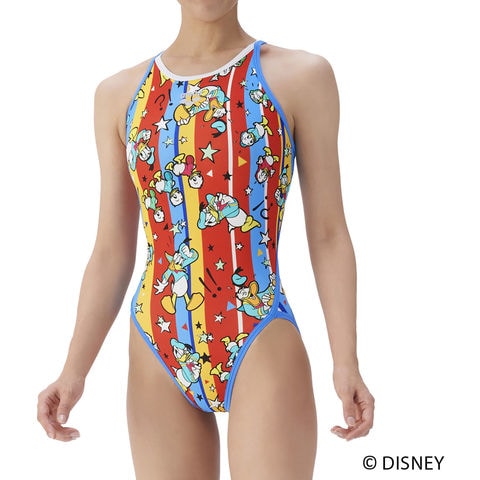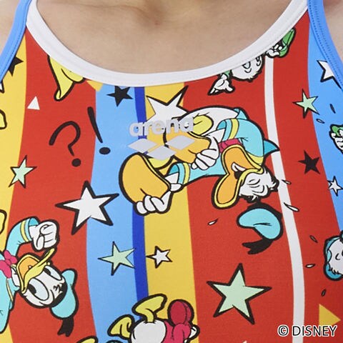 耐久性に優れたTOUGHSUIT(タフスーツ)シリーズの DisneY(ディズニー)デザインモデル.環境に配慮したリサイクルポリエステル素材を使用しており、塩素に強く長持ちするため、大会に向けて練習を重ねる頻度が高いスイマーにおすすめのトレーニング(練習)用水着.様々な表情やポーズをしたドナルド・ダックとその甥っ子たちヒューイ・デューイ・ルーイが描かれたプリントデザイン.カラフルなストライプ柄に星や記号が描かれたポップで可愛いデザインでトレーニング中の気分もアップ.水