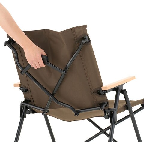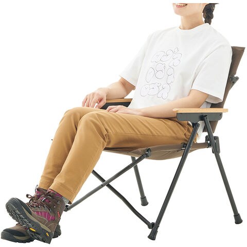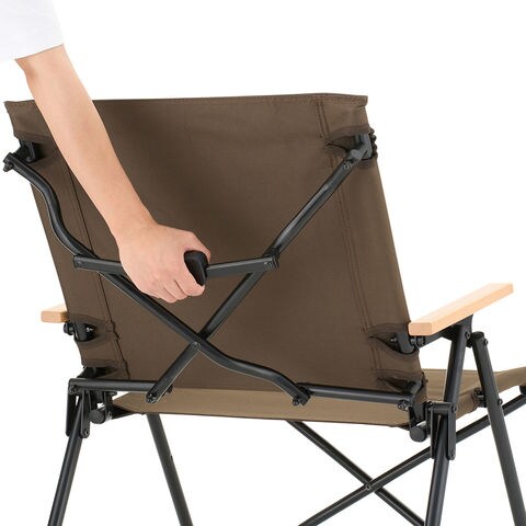 特徴:ロースタイルに最適.持ち運びしやすい軽量アルミフレーム.ローポジションスタイル.持ち運びやすい軽量なアルミフレーム.座面が沈み込みにくい快適な座り心地.木製アームレスト.スピーディーに設営・撤収.スリム収納.