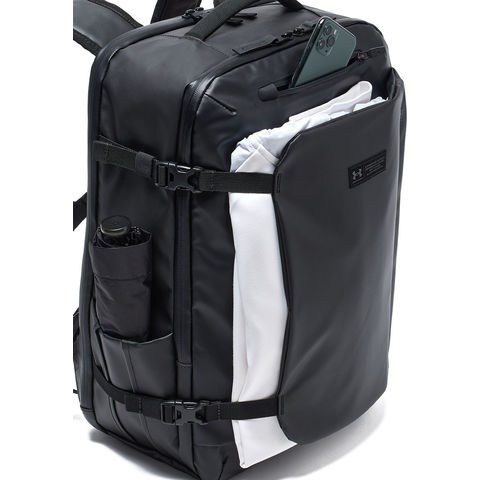 身体に沿った背面のパッドが背中をサポートし、背負い心地と通気性を確保.防水生地と止水ファスナーを採用.メインコンパートメントにはパソコン用の収納部分あり.メインコンパートメントにオーガナイザー付きのスペースあり.ペットボトルを入れられるサイドポケット.背面にあるジップにショルダーストラップを収納してブリーフケースにもできる2WAY仕様.背面のゴムバンドはスーツケースに引っかけられる.表に小物用収納付きのジャケットも掛けられるフラップを搭載.ショルダーストラップにはカードが入れられる収納スペース搭載.バックパックの底のリフレクトテープが視認性を確保.