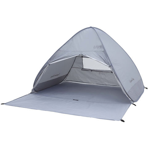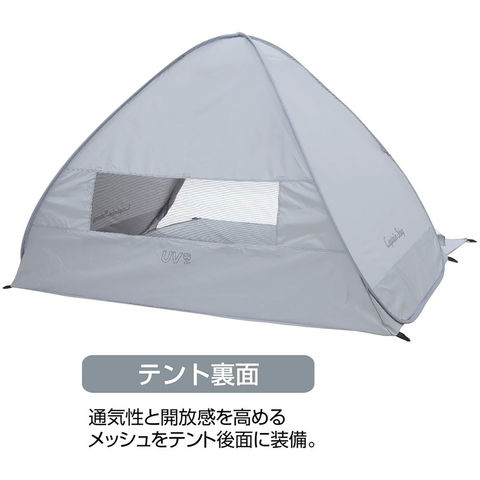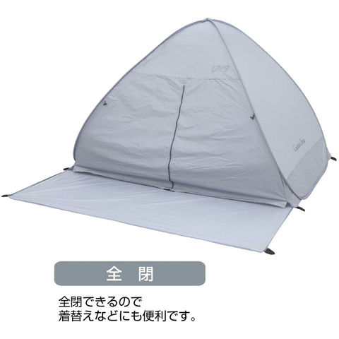 パッと広がるポップアップテント.テント内面はシルバーコーティングで夏の日差し、紫外線を 90 カット.ビーチやピクニックはもちろんアウトドアフィールドでも活躍.フロアの広さ ( 約 )2.7 畳 3 ~ 4 人用.テント前後面に出入口を装備テントサイド両面におもり用砂入れポケットを装備.テント奥行 150CM .キャリーバッグ付.