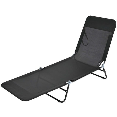 通気性・耐候性・耐水性に優れた 5 段階リクライニングベッド.丈夫なスチール製フレーム.持ち運びに便利なハンドル付き.