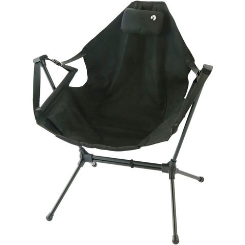 ゆったり設計のハンモック型チェア.体重移動で簡単リクライニング.コンパクトな収納設計.便利な内側ポケット.ヘッドレスト付.