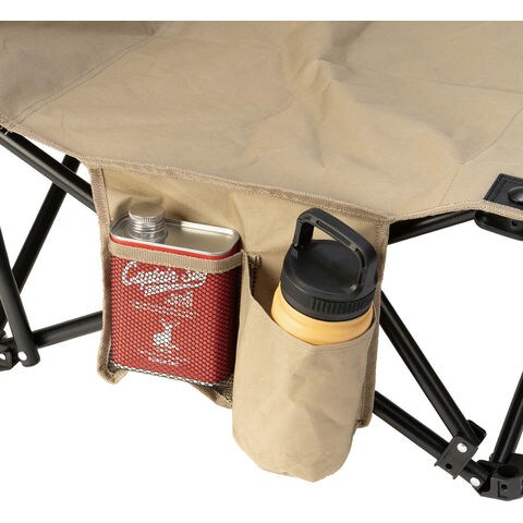 ワイドな座面で解放感のある座り心地.ボトルも入る 2 口サイドポケット.広げるだけの簡単組立.コンパクト収納.