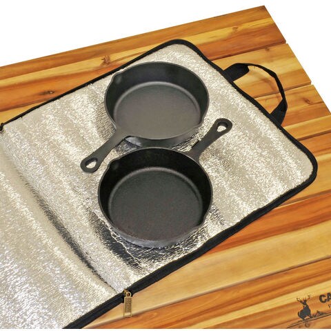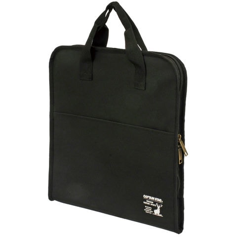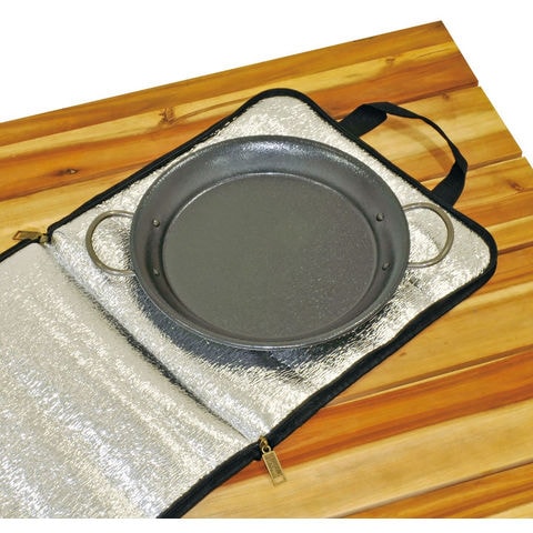 ラウンドグリルプレートの持ち運びや保管に便利な収納バッグ.フルオープン出来るので出し入れしやすく、お手入れも簡単. 28CM までのパエリアパンや 16CM のスキレットなどが収納可能.小物入れに便利なポケット付.