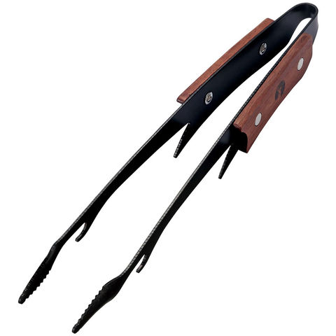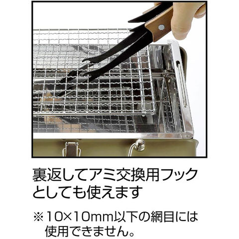 キャプテンスタッグのシンボル鹿のツノをモチーフにしたトング.ただ黒いだけじゃない、汚れが落ちやすいふっ素加工.裏返してアミ交換用フックとして使える、シェラカップやボウルの縁に掛けられる.焼く、食べるに適した長さ.