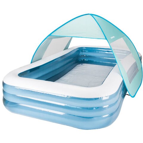 プール遊びの日差し対策.組立簡単、コンパクト収納可能.側面メッシュで視認性アップ.プールの幅に合わせてサイズ調整可能なバックルタイプ.キャリーバッグ付.
