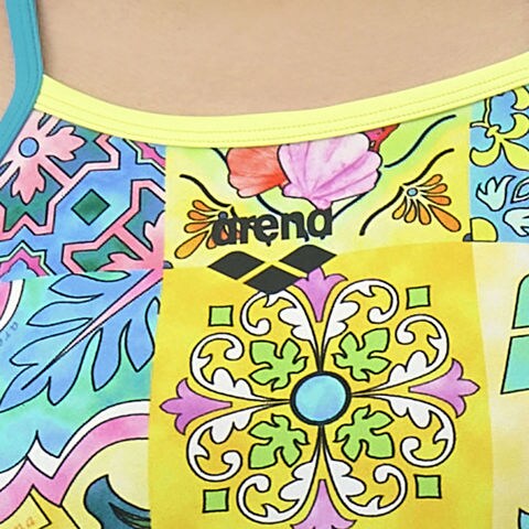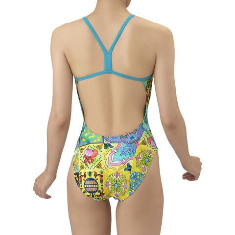 トレーニングカテゴリー[TOUGHSUITシリーズ].大会に向けて練習を重ねる頻度が高いスイマーにオススメの練習用水着.環境に配慮したリサイクルポリエステル素材[タフスキンT2E]を使用し塩素に強く長持ち.シーズンテーマのFUSIONCOLORSの総柄ワンピースタイプ.シンガポールの多民族・多文化の共存と相互尊重によって生み出されたプラナカン文化をオマージュし、豊かな色彩が特徴的な人種や文化の交わりをカラフルな4配色で表現.プラナカン建築の装飾に用いられるプラナカンタイルと呼ばれる、レリーフ調のタイルをモチーフに採用.※この商品は縫製上、一点一点プリント柄の見え方に違いが生じますので予めご了承ください.