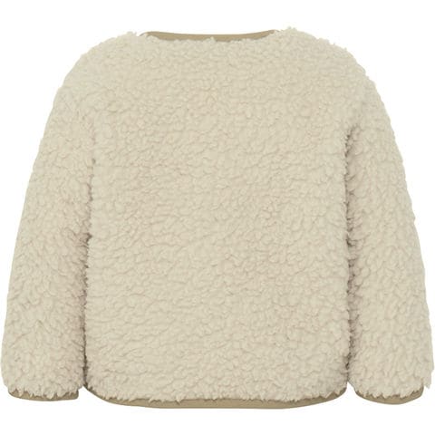 リサイクルポリエステルを使用した、保温性の高いフリースカーディガン.表面にはかさ高があり柔らかな毛足のボアフリース、肌面には滑らかな肌触りのマイクロフリースをボンディングした生地を採用しています.フロントはドットボタンで着脱がしやすく、袖口や裾、襟はすっきりとしたパイピング仕様です.配色がかわいらしいカラーバリエーション.左胸のロゴワッペンがデザインのアクセントになっています.秋~冬の外遊びやお出かけなど、幅広く活用できるアイテムです.