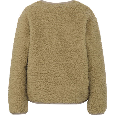 リサイクルポリエステルを使用した、保温性の高いフリースカーディガン.表面にはかさ高がある毛足の長いボアフリース、肌面には滑らかな肌触りのマイクロフリースをボンディングした生地を採用しています.両サイドにはポケットを配置.フロントはドットボタンで着脱がしやすく、袖口や裾、襟はすっきりとしたパイピング仕様です.表側と裏側の配色がかわいらしいカラーバリエーション.左胸のワッペンがデザインのアクセントになっています.秋から冬のキャンプなどアウトドアアクティビティから通学などの普段使いまで、幅広く活用できるアイテムです.