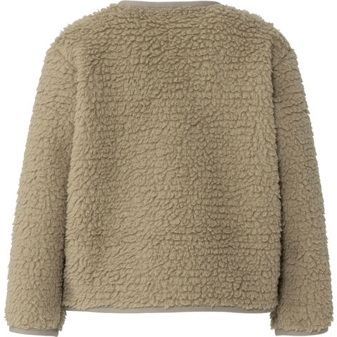 リサイクルポリエステルを使用した、保温性の高いフリースカーディガンのトドラーモデル.表面にはかさ高がある毛足の長いボアフリース、肌面にはなめらかな肌触りのマイクロフリースをボンディングした生地を採用しています.両サイドにはポケットを配置.フロントはドットボタンで着脱がしやすく、袖口や裾、襟はすっきりとしたパイピング仕様です.表側と裏側の配色がかわいらしいカラーバリエーション.左胸のワッペンがデザインのアクセントになっています.秋から冬のキャンプなどアウトドアアクティビティから通園などの普段使いまで、幅広く活用できるアイテムです.