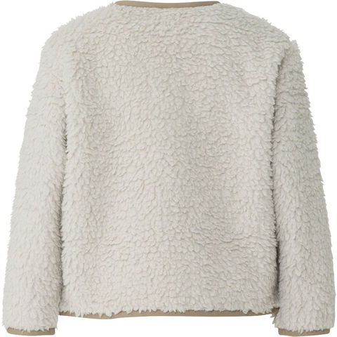 リサイクルポリエステルを使用した、保温性の高いフリースカーディガンのトドラーモデル.表面にはかさ高がある毛足の長いボアフリース、肌面にはなめらかな肌触りのマイクロフリースをボンディングした生地を採用しています.両サイドにはポケットを配置.フロントはドットボタンで着脱がしやすく、袖口や裾、襟はすっきりとしたパイピング仕様です.表側と裏側の配色がかわいらしいカラーバリエーション.左胸のワッペンがデザインのアクセントになっています.秋から冬のキャンプなどアウトドアアクティビティから通園などの普段使いまで、幅広く活用できるアイテムです.