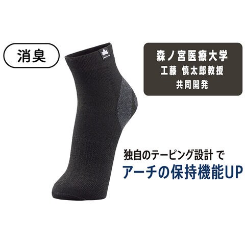 森ノ宮医療大学と共同開発のテーピング構造を靴下で体感できる、歩行に特化したウォーキングソックス.テーピングのような効果を靴下で気軽に体感できる、理学療法の視点から設計された新しいウォーキングソックス.森ノ宮医療大学・工藤慎太郎教授と共同開発し、かかとから足裏、親指の甲側へ向けてテーピングのように力を加える編み構造を採用.テーピングの理論を忠実に再現した編み方で、足のアーチをしっかりサポートし、安定した歩行とスムーズな足運びを後押しします.さらにニオイをおさえる消臭機能も搭載し、毎日の通勤やお出かけ、スポーツ、長時間の立ち仕事にもぴったりです.