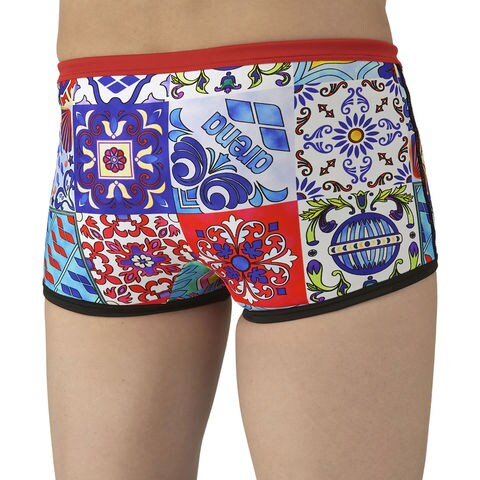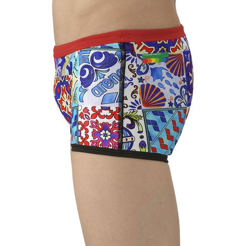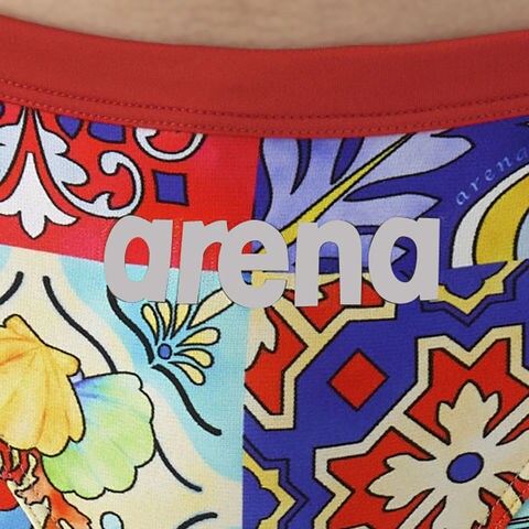 トレーニングカテゴリー[TOUGHSUITシリーズ].大会に向けて練習を重ねる頻度が高いスイマーにオススメの練習用水着.環境に配慮したリサイクルポリエステル素材[タフスキンT2E]を使用し塩素に強く長持ち.シーズンテーマのFUSIONCOLORSの総柄ショートレッグタイプ.シンガポールの多民族・多文化の共存と相互尊重によって生み出されたプラナカン文化をオマージュし、豊かな色彩が特徴的な人種や文化の交わりをカラフルな4配色で表現.プラナカン建築の装飾に用いられるプラナカンタイルと呼ばれる、レリーフ調のタイルをモチーフに採用.※この商品は縫製上、一点一点プリント柄の見え方に違いが生じますので予めご了承ください.