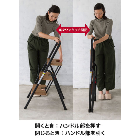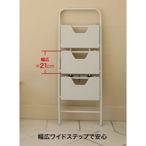 【安定感抜群】大きなステップ面なので安定感があり、奥行きは約21cmと幅広ワイド設計.まるで移動できる階段のような安心感で、足をしっかりとついて昇り降りが出来ます.【スリム収納】畳むと奥行き8.3cmまで薄くなるので、冷蔵庫の横やベッドの下など、ちょっとした隙間に収納出来ます.また、持ち運ぶときにもスリムになるので便利です.【楽々ワンタッチ】指を挟みにくく、女性でも楽々開閉出来る安心構造.使わないときはサッと畳めます!昇っている時に閉じてしまうなどの危険から守るロック付き.【耐荷重100kg】安心の耐荷重100kgなので、ちょっと届かない時もサッと取り出して使えるから、毎日の荷下ろしがとてもラクなんです!
