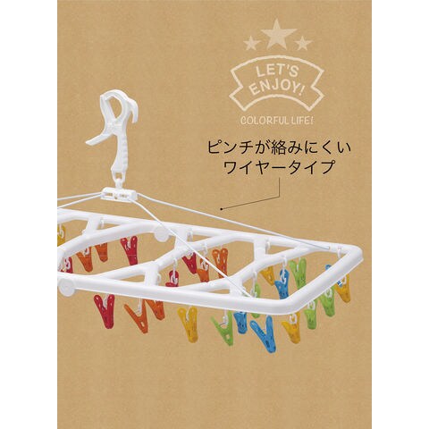 家族の洗濯物をまとめて干すのにちょうど良い大きさ.掛け間違いを防ぐカラフルピンチ.見た目の可愛さだけでは無く、同じ色同士が対になっているので、タオルなどを干した際の掛け間違いを防いでくれます.絡まりにくいピンチを使用しているので、取り扱いが楽です.キャッチフックなので、風がある日の外干しも安心です.洗濯物を取り込む際も掴むだけで簡単に取り込むことが出来ます.キャッチフック横にある小さなフックを使用すれば、物干し竿だけでは無く、ロープでも干すことが可能です.風が強い日や、取り込む際にピンチが絡むのを防止してくれるワイヤーフレームなので、快適にお使い頂けます.