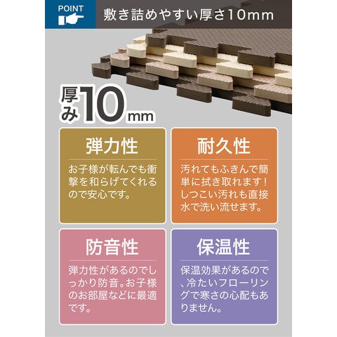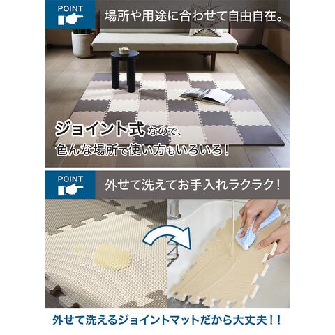 ジョイント式で場所や用途に合わせて使い方自由自在:リビングや子供部屋はもちろん、水に強い素材なので洗面所やキッチンなどにもお使い頂けます.外せて洗えてお手入れ楽々:お手入れは拭き取るだけで良いので、汚れても安心.しつこい汚れは部分的に外して水洗いも出来ます.
