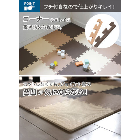 特徴:【フチ付きなのでお部屋の角にもぴったりフィット】フチが付いてるので、お部屋の角や壁際にぴったりフィットします.つまずきにくく切って調整する手間もありません.そのまま敷いてすぐに使えるジョイントマットです.