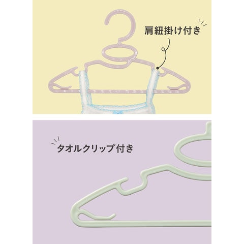 ベビー服や子供服も専用のハンガーでキレイに干せる!使いやすさにこだわった[ベビー&キッズハンガー12本組].スリット入りなので、首元を伸ばさずに干せます.肩紐掛け付きなので、肌着やワンピースなど滑らず干せて楽ちん.使用出来るサイズは洋服のデザインや形によって異なりますが、このハンガーは80~120サイズまでを目安にお使いいただけます.クローゼットへそのまま収納するのに使いたくなるようなくすみカラー.※6カラー×各2本セット