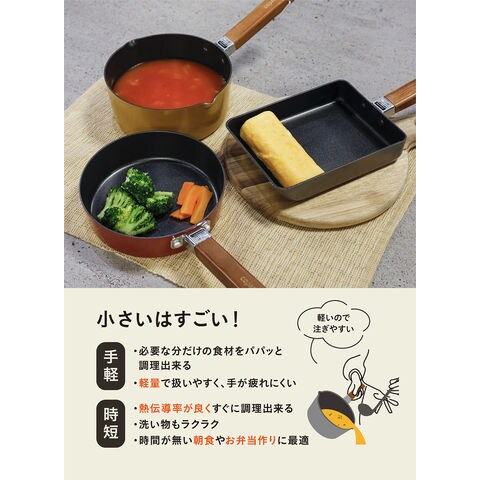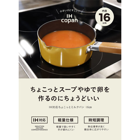 スープをサッと作るのにちょうどいい、IH対応ちょこっとミニミルクパン16cm.食材を煮込むときやスープをかき混ぜるときも、程良い深さがあるのでこぼれにくい.左右に注ぎ口が付いているので、向きを気にせず注ぐことが出来ます.熱伝導率が良く、すぐに煮込めるので、あと一品スープを足したいときにもオススメです.内面はふっ素加工なので、柔らかいスポンジと中性洗剤で洗い流すだけ.汚れが付きにくく落ちやすい.軽量で扱いやすいので疲れにくいのも特徴.シンプルで飽きのこないデザインで、ちょこっとシェフ気分が味わえます.吊るして収納できるので、気軽に毎日の料理をもっと楽しみましょう.