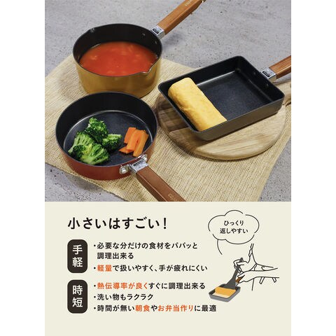 厚焼き玉子や玉子焼きをサッと作るのにちょうどいい、IH対応ちょこっと玉子焼きパン.家族のお弁当用や、1人分の玉子焼きにピッタリです.前面の傾斜はフライ返しが差し込みやすく、深型にもなっているので、食材がこぼれにくい.お弁当の具材を足したいときも扱いやすい.内面はふっ素加工なので、柔らかいスポンジと中性洗剤で洗い流すだけ.汚れが付きにくく落ちやすい.軽量で扱いやすいので疲れにくいのも特徴.シンプルで飽きのこないデザインで、ちょこっとシェフ気分が味わえます.吊るして収納できるので、気軽に毎日の料理をもっと楽しみましょう.