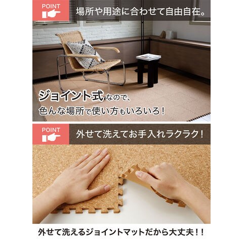 夏はサラッと、冬は暖かく.好きな形につなげて敷けるクッション性のある[やわらかコルクマット細目8枚組]表面がコルクなので、つなぎ目が目立ちにくい.
