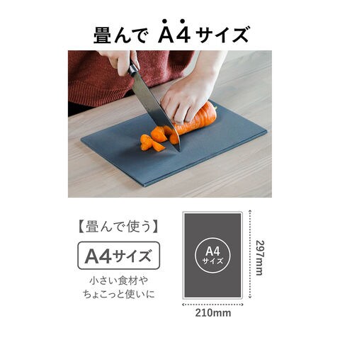 特徴:畳んでA4、広げてA3のラージサイズ.たくさんの食材を使う方におすすめ.切った食材を一時置き出来るスペースが十分にあります.両面ともまな板として使えるので、お肉や野菜などの食材によって裏表で分けることも可能です.