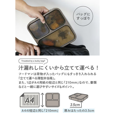 【立てて運べる】通勤や通学のバッグは、荷物でいっぱい!フードマンはそんなバッグにもすっきり入れられる[立てて運べる薄型弁当箱].A4用紙の短辺と同じ210mmなので、書類などと一緒に持ち運んでも、すっきり収まります.ランチトートなど別持ちしなくて良いので、荷物が増えず通勤通学が快適!【汁漏れしにくい】一体型のパッキンと4点ロックで汁漏れを防止します!本体の周囲と中仕切りをシーリングするWシーリング構造で、汁漏れを防止します.各スペースの汁移りも防ぐので、おかずなどの味移りも防止します.【お手入れ簡単】汚れが溜まりやすい[角]がない丸型コーナーなので、洗い物も簡単です.また、食器洗浄器対応なので、日常使いにも最適です.