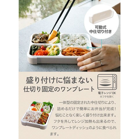 【立てて運べる】通勤や通学のバッグは、荷物でいっぱい!フードマンはそんなバッグにもすっきり入れられる[立てて運べる薄型弁当箱].A4用紙の短辺と同じ210mmなので、書類などと一緒に持ち運んでも、すっきり収まります.ランチトートなど別持ちしなくて良いので、荷物が増えず通勤通学が快適!【汁漏れしにくい】一体型のパッキンと4点ロックで汁漏れを防止します!本体の周囲と中仕切りをシーリングするWシーリング構造で、汁漏れを防止します.各スペースの汁移りも防ぐので、おかずなどの味移りも防止します.【お手入れ簡単】汚れが溜まりやすい[角]がない丸型コーナーなので、洗い物も簡単です.また、食器洗浄機対応なので、日常使いにも最適です.