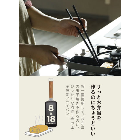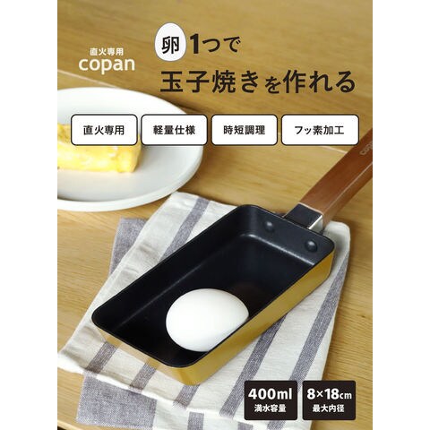卵一つで玉子焼きをサッと作るのにちょうどいい、スリム型の[copan(コパン)卵1つで作れるちょこっと玉子焼きパン]玉子の形を崩しにくく、ひっくり返しやすい.トーストの半分がピッタリ焼けるサイズ(内寸:約8×18cm)で、朝食にフレンチトーストを作るときや、小腹が空いたときにもちょこっと作れて便利です.忙しい朝でもスリム型の玉子焼きフライパンなら場所を取らず素早く調理が出来ます.ウインナーをサッと焼いて作るのにもちょうどいいサイズです.内面はふっ素加工なので、柔らかいスポンジと中性洗剤で洗い流すだけ.汚れが付きにくく落ちやすい.軽量で扱いやすいので疲れにくいのも特徴.