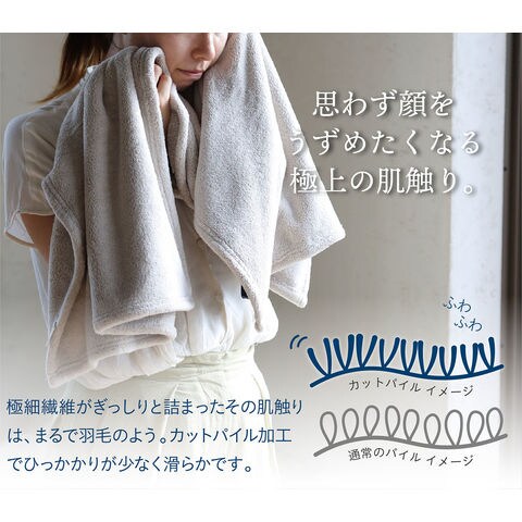 思わず顔をうずめたくなるような肌触り:極細繊維がぎっしりと詰まったその肌触りは、まるで羽毛のよう.洗顔の後やお風呂上がりも優しく包み込んでくれます.