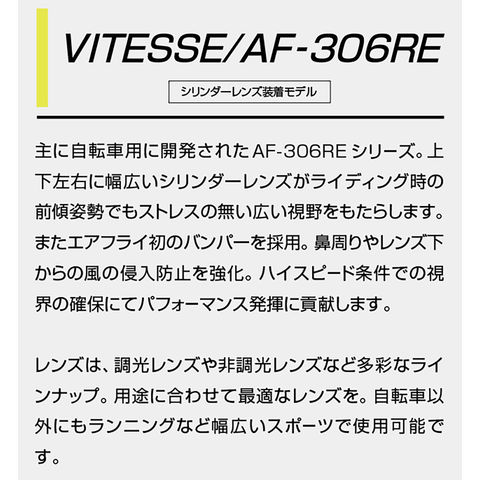 世界初、世界特許取得の鼻パッドがないスポーツサングラスの AF-306 、よりハードなスポーツにも対応が出来る様にアンダーバンパーを採用し、安全性能を高めたモデル.世界最高峰の自転車ロードレースのツールドフランランスやオリンピックなど国内外で活躍するプロ自転車ロードレーサーとの共同開発モデルです.自転車に限らず、マルチスポーツに対応できるモデルでもあり、 AF-306 C-2 は可視光線透過率 10 ~ 50% の調光シルバーミラーレンズ装着の全天候型モデルです.鼻パッドの代わりに調整可能なサイドパッドで支えます.テンプルも頭の形に合わせて自在にまげられるます.鼻パッドが無い事により跡が付かず、汗もたまりません.軽量である為長時間着用してもスト・