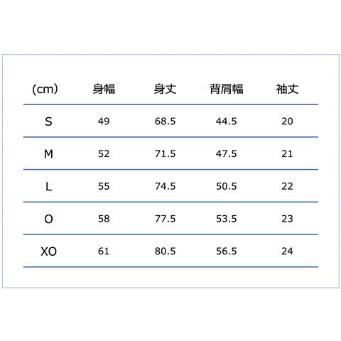 サイズ:S/チェスト86-90cm、身長162-167cm、M/チェスト90-94cm、身長167-172cm、L/チェスト94-98cm、身長172-177cm、O/チェスト98-102cm、身長177-182cm、XO/チェスト102-106cm、身長182-187cm