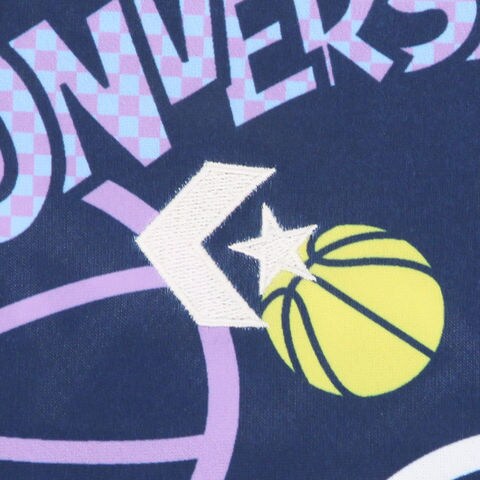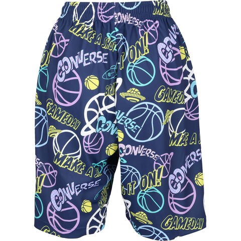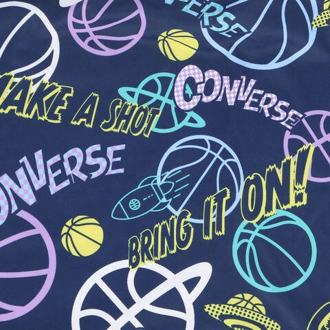 コンバースのジジュニアバスパン.バスケットボールのアイコンをカラフルに表現した総柄パンツ.柔らかな肌触りに吸汗速乾を兼ね揃えたスポーツ向けアイテム.