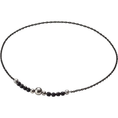 天然石×純チタンチェーンのネックレス.成功の象徴[オニキス]には黒、神秘的な輝きを放つ[水晶]にはシルバーの純チタンチェーンを合わせたネックレス.角度で輝きを変える W 小豆チェーンを採用し、ファイテンの独自素材[メタックスカーボンセラミック]を配合したパーツを 2 個配置.服装を選ばない上質なデザインで、贈り物にも最適です.